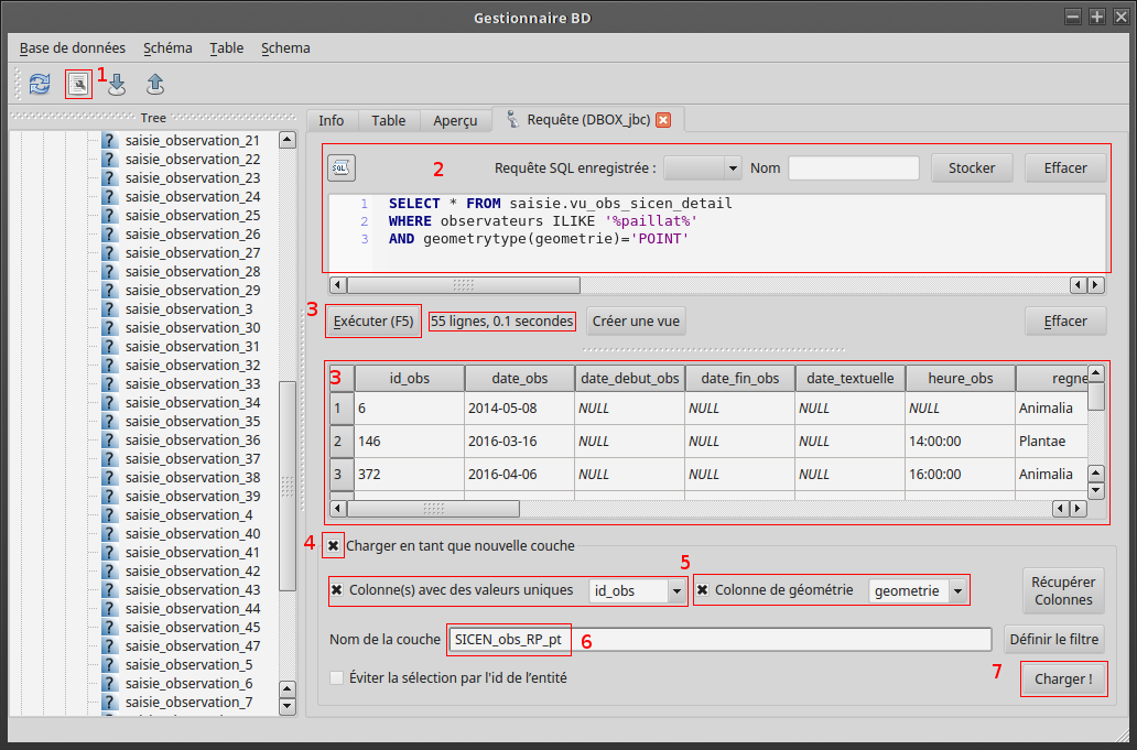- en 7 vous chargez le résultat de votre sélection dans Qgis.
