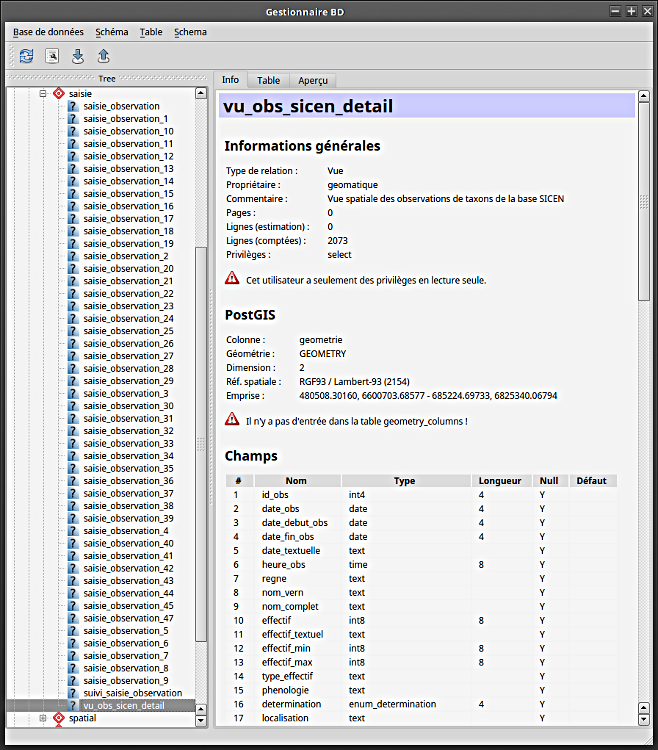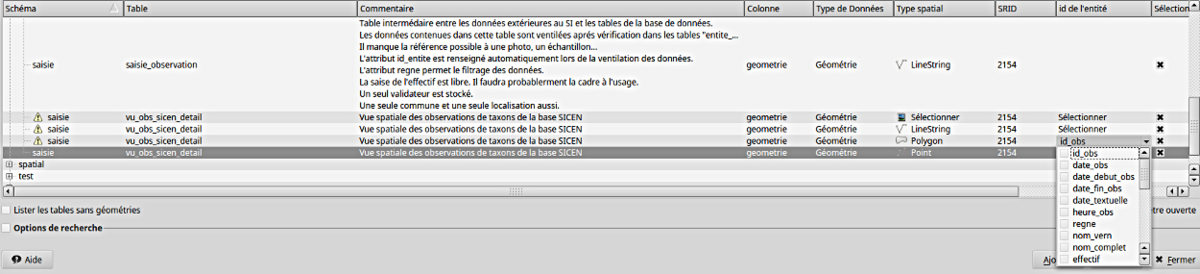 - le nom de la table doit être écrit avec le nom du schema d’où saisie.vu_obs_sicen_detail