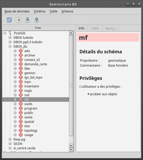 En la dépliant, vous verrez apparaître les différentes connexion postgis que vous avez créer et en dépliant encore la liste des schémas disponibles dans la base.