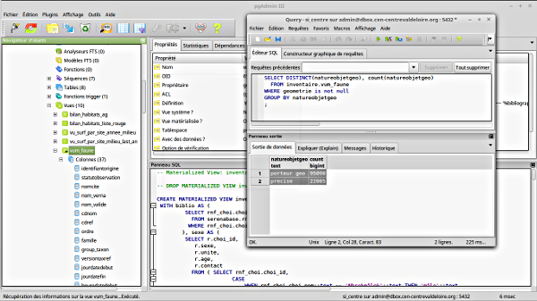 Aussi, dans le cas de données dont les modifications ne sont pas fréquentes, et c’est le cas pour nos données naturaliste, une autre notion est fort utile, la vue matérialisée. Le résultat de la requête ne reste pas uniquement en mémoire, mais il est écrit dans une table. On obtient de ce fait les mêmes temps d’accès qu’une table de données. Oui, mais alors, comment être sur que j’ai bien les données à jour ? Et bien le rafraîchissement du contenu de cette vue matérialisée est définit par l’administrateur de la base postgresql.