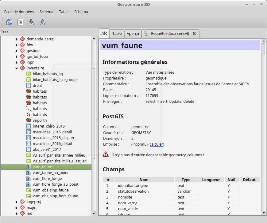 Le Cen Centre-Val de Loire est équipé de 2 outils de bases de données naturalistes. Les deux outils stockent leurs données dans notre base régionale postgresql. Tout cela est expliqué dans ce précédent article. Afin de faciliter l’interrogation des données issues des deux outils, nous avons mis en place deux nouvelles tables (des vues matérialisées pour être plus précis) :