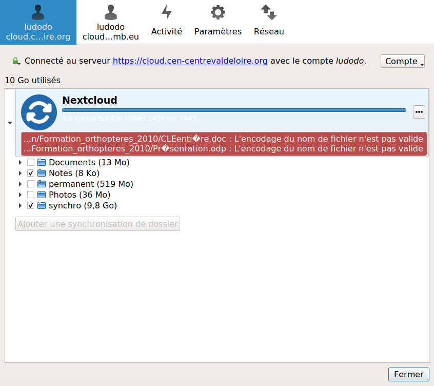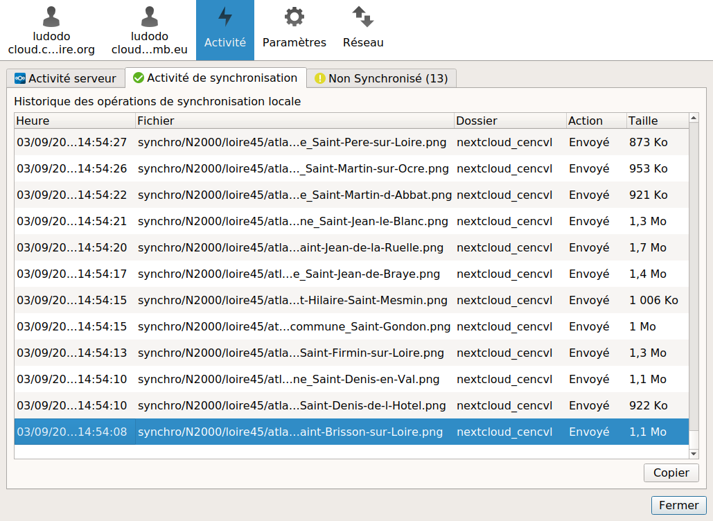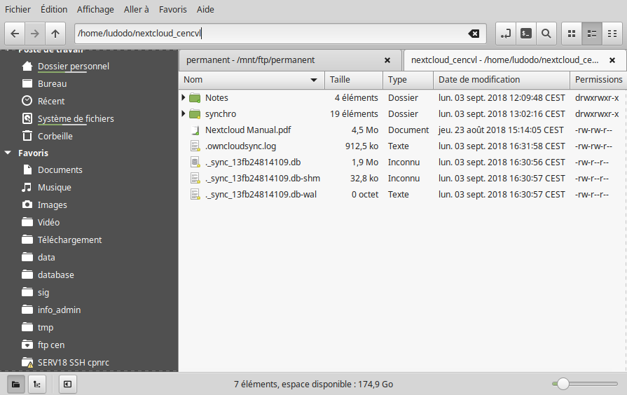 - quand vous souhaitez mettre en ligne des données, copier les avec votre explorateur de fichier dans le répertoire qui va bien. Sur la capture ci-dessous, le répertoire locale est "home/ludodo/nextcloud_cencvl/synchro", c’est là qu’on va copier nos fichiers, comme dans n’importe quel autre répertoire local.