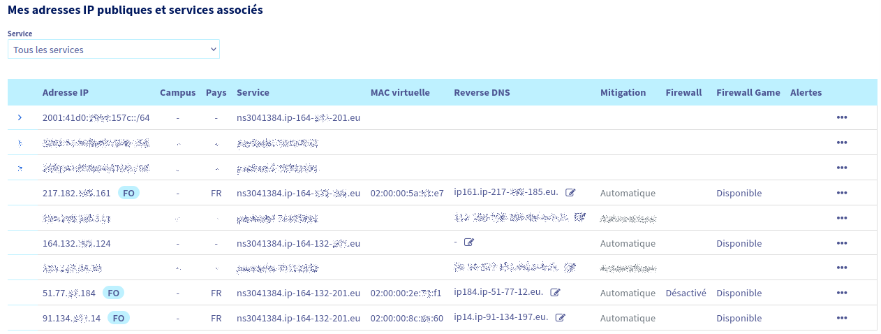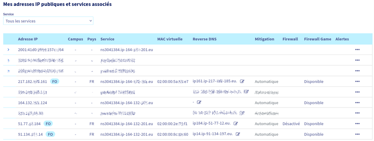 En exemple, voici la liste des IP additionnelles créés sur notre espace client :