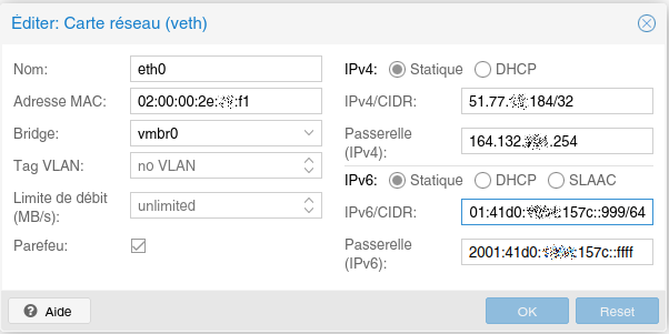 Premier étape, faire en sorte que l’hôte proxmox soit visible et puisse naviguer en IPV6. Pour cela l’article suivant décrit bien la configuration à mettre en place, tout comme celui de la documentation OVH.