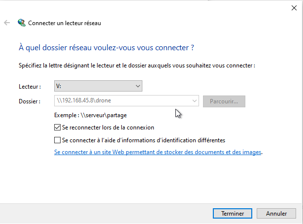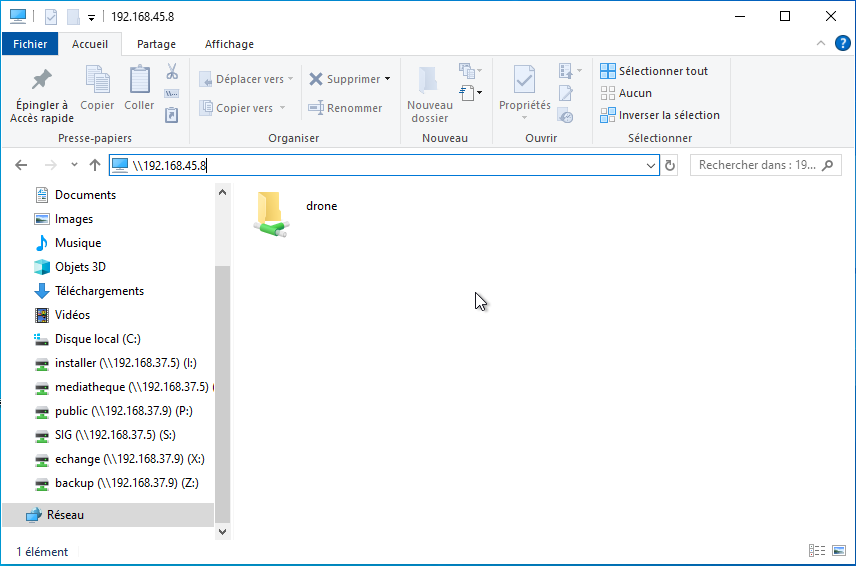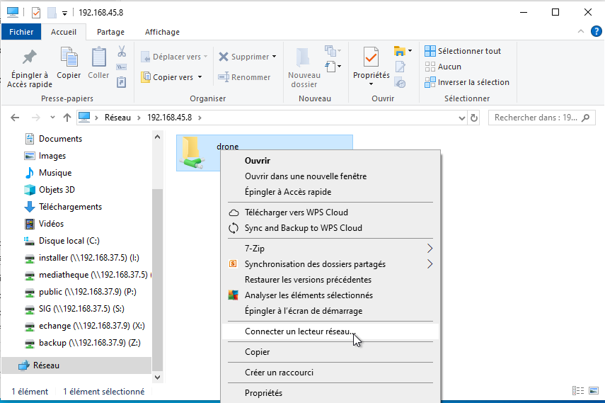Si vous souhaitez en faciliter les prochains accès, vous pouvez faire le choix de créer un "lecteur réseau" complémentaire. Pour cela, au niveau du partage "Drone", vous cliquez sur le bouton droit de la souris et vous choisissez "connecter un lecteur réseau"