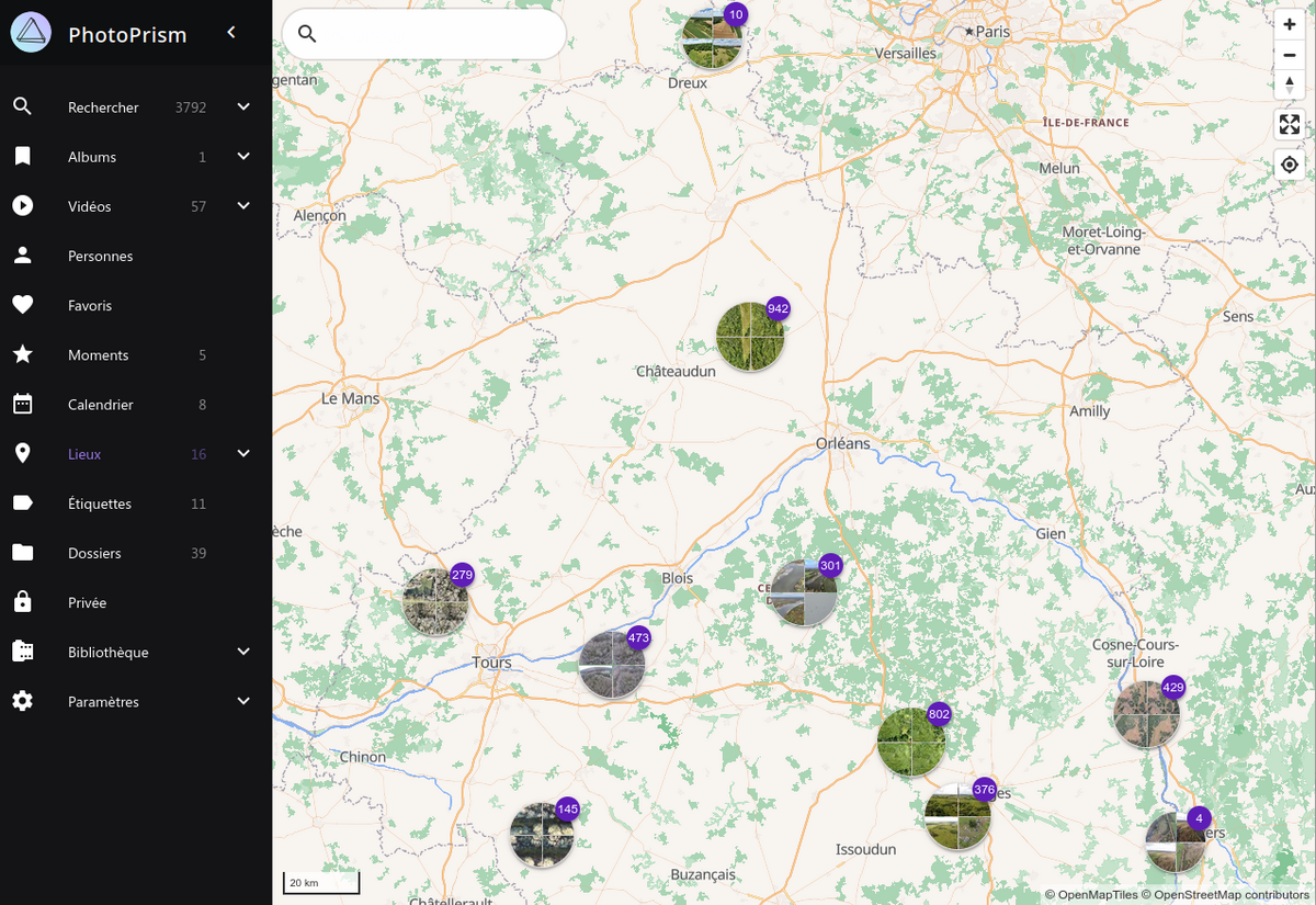 Une autre façon d’y accéder est l’utilisation de l’outil photoprism qui est une photogallery web. Il vous est possible de consulter par dossier, mais également depuis une carte (cf capture ci dessous).