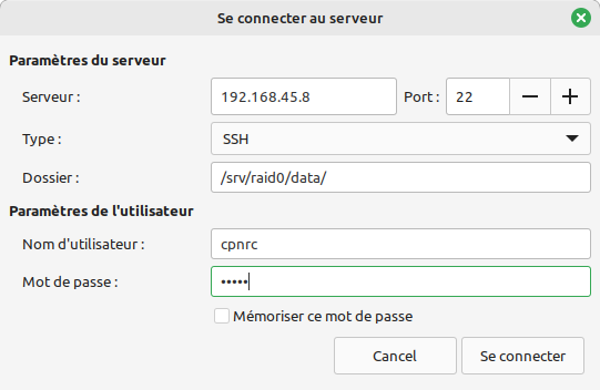 Ici exemple de connexion en sftp (ssh) :