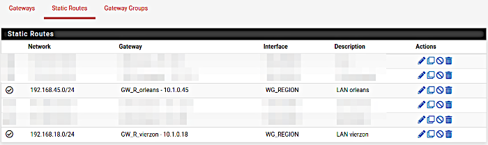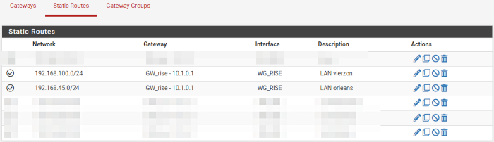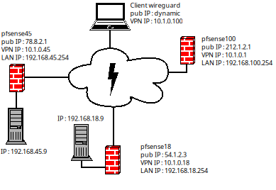 En effet dans un premier temps, nous étions parti sur des tunnels wireguard indépendants entre chaque site, d’où un "paquet" de tunnels, et une connexion nomade déjà géré sur le pfsense100 avec openVPN. Seulement, il nous a été impossible de router les flux openvpn vers les tunnels wireguard dans pfsense. Je ne dis pas que c’est infaisable, mais pour notre part pas réussi.