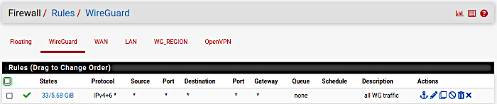Parefeu, regle WireguardLudovic LestratA noter que nous considérons pour notre part que les droits sont identiques quelque soit le tunnel VPN concerné. Si vous voulez faire des distinctions de droits, il faudra utiliser l’onglet spécifique à votre tunnel, ici visible en tant que "WG_region" pour mettre des règles spécifiques. Ces particularité vous obligeront à modifier le paramétrage de Wireguard (menu VPN->Wireguard, onglet settings) "Interface Group Membership" à "Only assigned Tunnel".