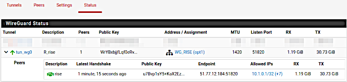 - allons voir le statut dans le menu VPN-> Wireguard-> statut, derouler la liste des peers avec le bouton devant le tunnel, vous deviez obtenir quelque chose comme la capture ci dessous des 2 côtés