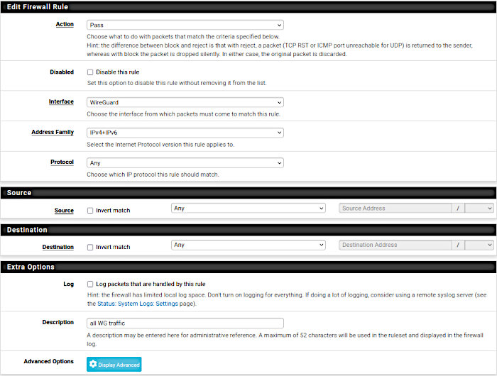 - troisième élément à mettre en place, autoriser les flux qui passent dans le tunnel Wireguard a dialoguer avec les autres réseaux, pour cela menu Firewall->Rules dans l’onglet Wireguard, ajouter une règle qui autorise tout ce qui passe sur les interfaces réseaux de type VPN wireguard à circuler partout, quelque soit le port et le protocole,