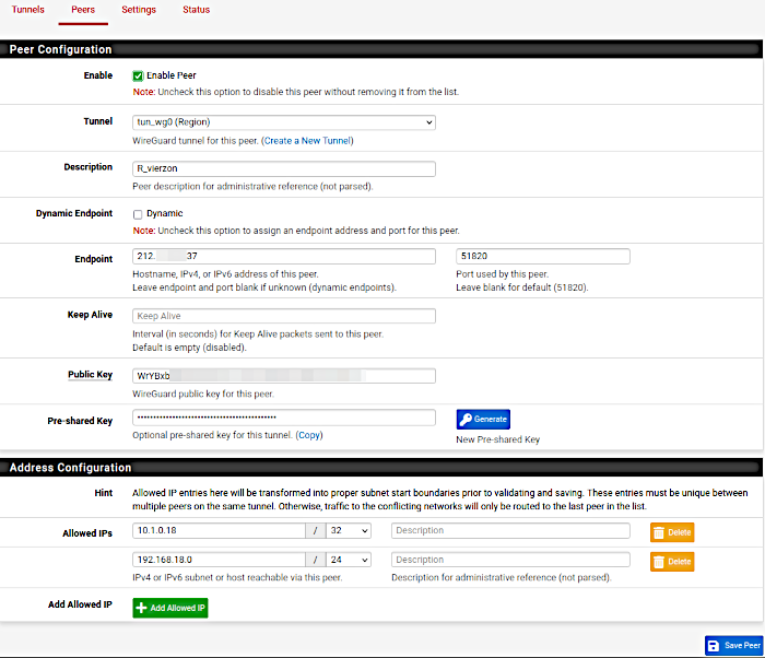- on enregistre le peer et valide les modifications. Il faudra revenir ici pour compléter les éléments qui nous manque à ce stade, à savoir la "public key" du tunnel du pfsense18