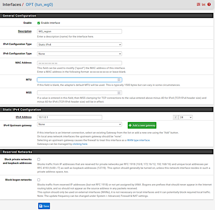 - interfaces : choisir l’interface reseau WG_region (tunnel VPN de wireguard),