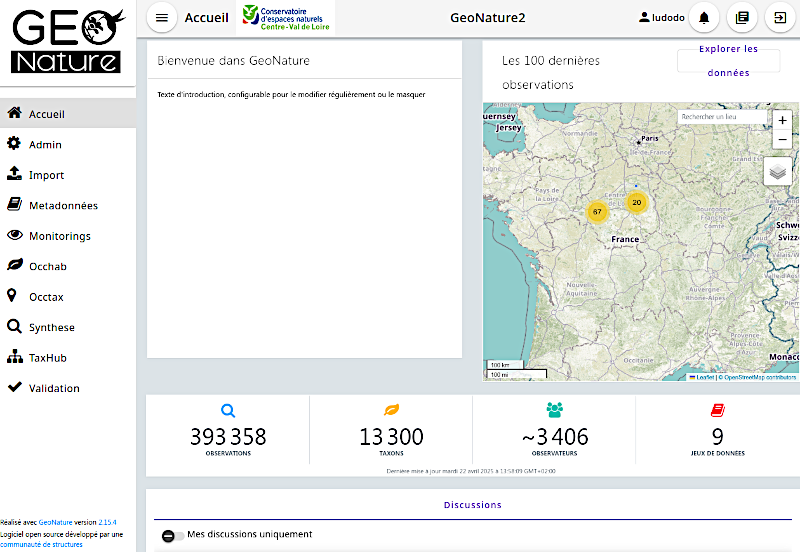 - l’administrateur peut avoir paramétré côté base des accès à d’autres bases. Pour notre instance, les données issues des bases Serena (Cen 41 et CVL) ont été importées. Les données issues de SICEN sont quand à elle actualisées deux fois par jour pour être consultable ici.