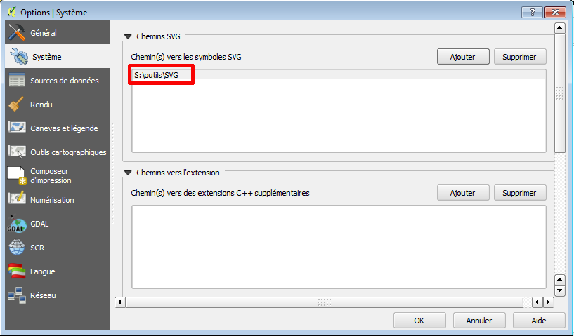- dans les "chemins SVG", cliquer sur ajouter et aller déclarer le chemin "S :\outils\SVG" (ou d :\sig\outils\SVG pour les postes "nomades", me contacter pour mise à jour du contenu de ce répertoire)
