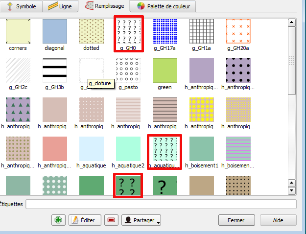 - aller dans l’onglet Remplissage, si vous voyez des symboles avec des " ?" (comme ci-dessous entouré en rouge), c’est que Qgis ne trouve pas certains symboles SVG sur votre configuration.