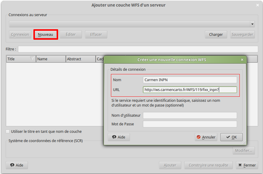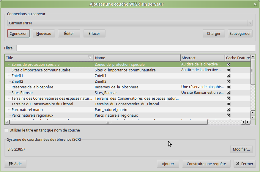Le flux défini apparait alors dans la liste déroulante et en cliquant sur "connexion", la liste des couches disponibles se met à jour. Il vous est alors possible de les ajouter sur votre carte, voir de filtrer le contenu avec le bouton "construire une requête"