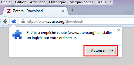 2. une petite fenêtre apparaît en haut à gauche indiquant « Firefox a empêché ce site (www.zotero.org) d’installer un logiciel sur votre ordinateur ». Ne paniquez pas, cliquez sur le bouton « Autoriser ».
