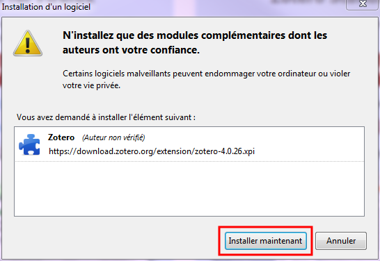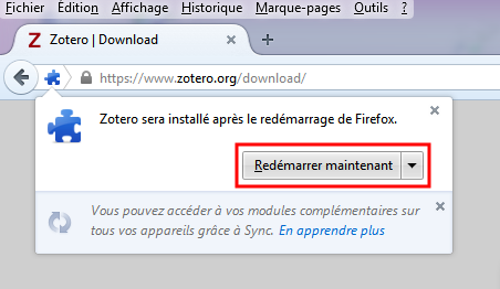 4. une nouvelle fenêtre vous informe que « Zotero sera installé après le redémarrage de Firefox ». Cliquez sur « redémarrer maintenant ».