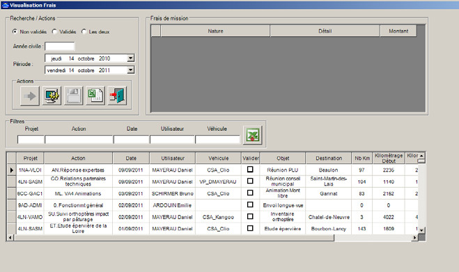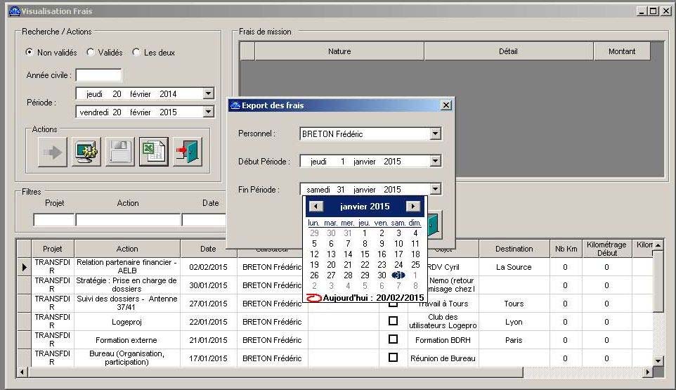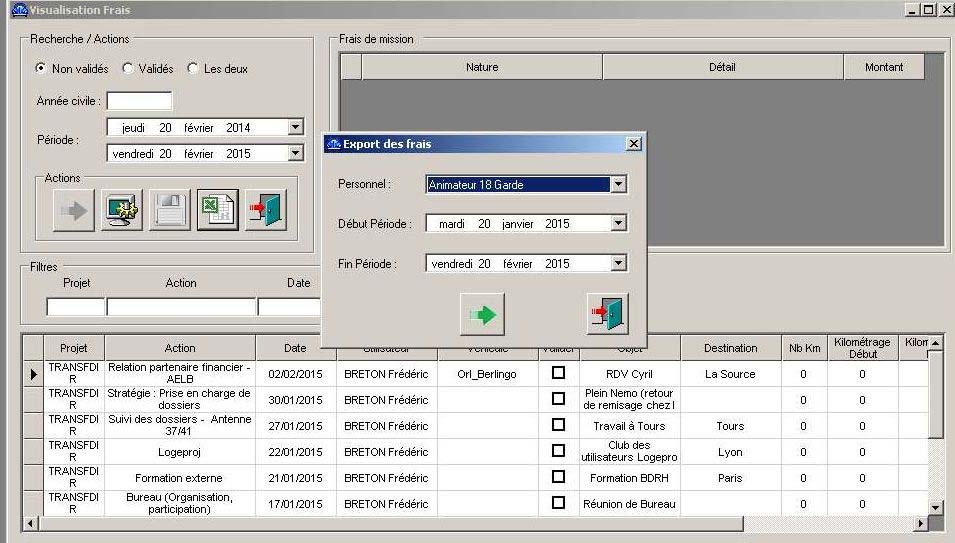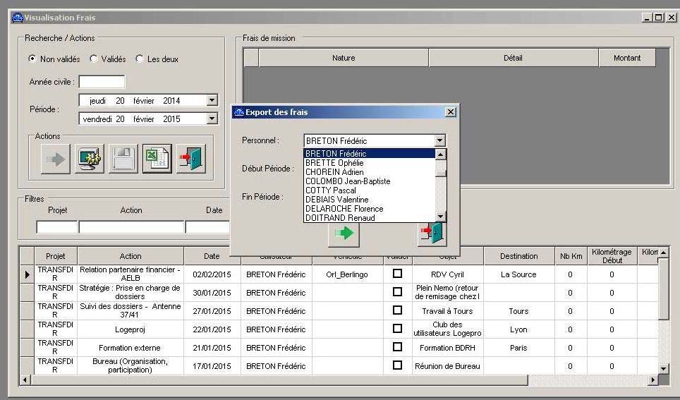 Celle-ci se fait dans le menu Outils -> Visualisation frais de déplacement qui affiche l’ensemble des frais de déplacement entrés dans Logeproj.