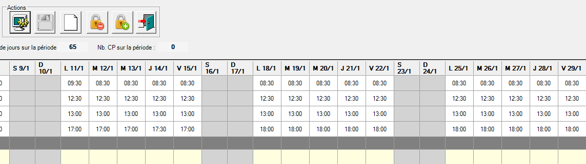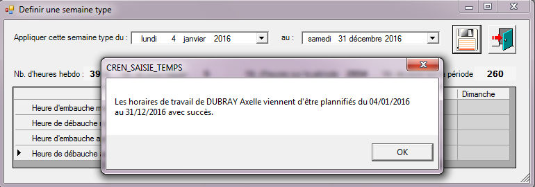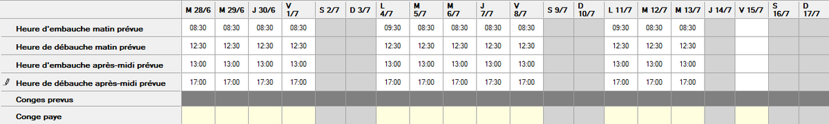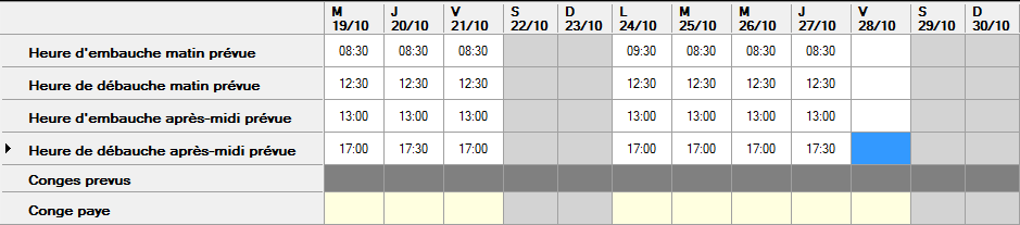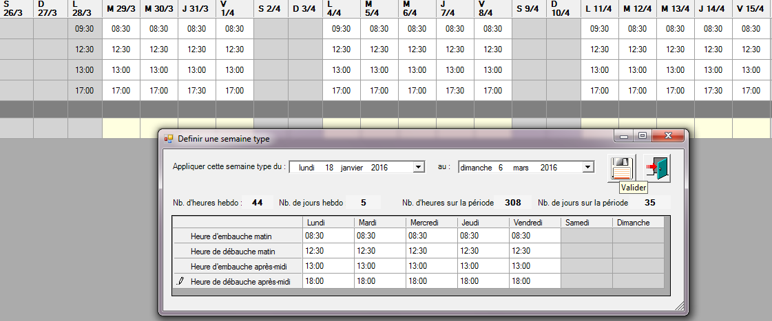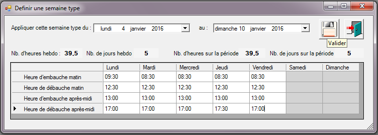 Des horaires sont déjà saisis par défaut, à chaque utilisateur de les modifier en fonction des horaires souhaités pour la semaine type en renseignant les heures d’embauche/ débauche matin et après-midi. L’utilisation des tabulations et la fonction copier/coller sont possibles dans cette fenêtre pour procéder aux modifications.