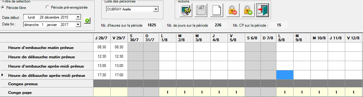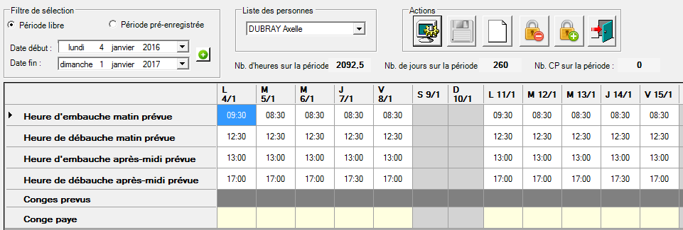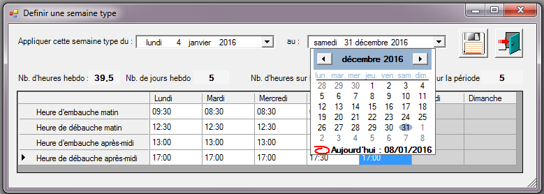 Cette fenêtre calcule ainsi le nombre d’heures hebdomadaires, le nombre de jours travaillés pour une semaine type, ainsi que le nombre d’heures et le nombre de jours travaillés sur la période.