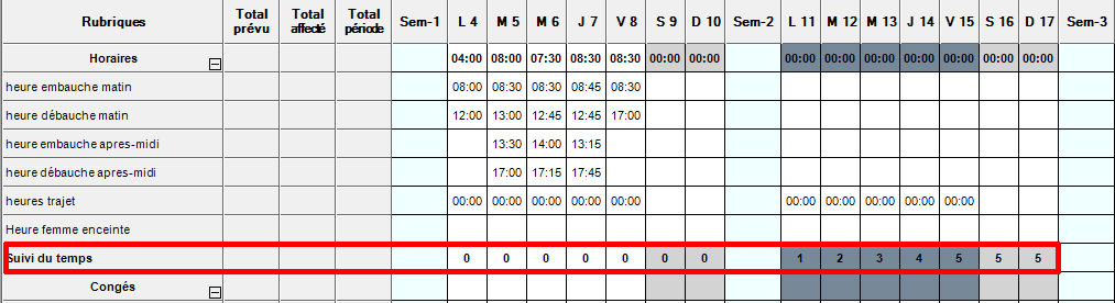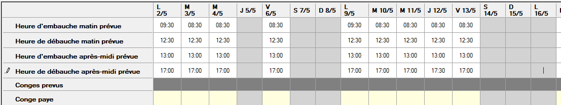 Les jours fériés sont grisés ce qui permet de les identifier facilement en saisie manuelle ou d’aller supprimer les heures qui auraient pu être incrémentées sur ces jours-là en définissant une ou plusieurs semaines types.
