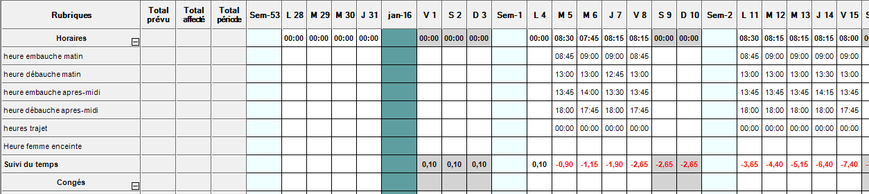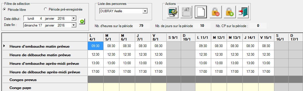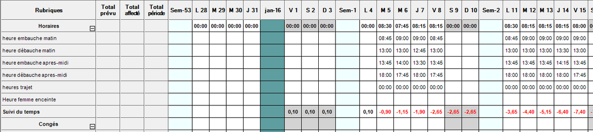 Saisie des horaires (heures embauche et débauche matin et après-midi) ou des congés (CP, maladie ou autres par journée ou demi-journée)