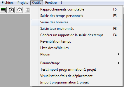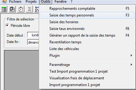Dans le menu Outils, sélectionner saisie des temps personnels pour afficher la fenêtre de saisie des temps réalisés sur les projets et les horaires réels pratiqués.