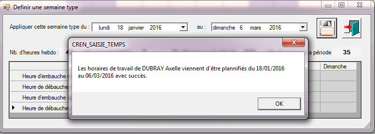 Une fois la période sélectionnée et validée au moyen de la disquette, une fenêtre s’ouvre indiquant la période pour laquelle la saisie des horaires prévisionnels a été validée. Cette opération peut prendre 2-3 minutes. Il faut attendre l’apparition du message de confirmation (cf ci-dessous).