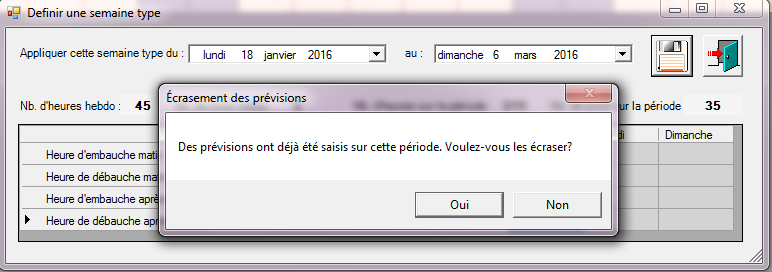 Si des heures ont déjà été prévues sur cette période en saisie manuelle ou en en définissant une semaine type préalable incluant cette période, cliquez sur « oui » pour que cela écrase bien la saisie précédente et prenne en compte cette semaine type pour les périodes souhaitées à modifier.