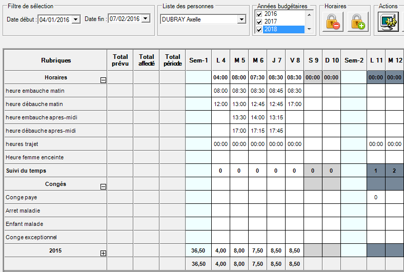 Une fois toutes les saisies horaires renseignées et ajustées et les CP posés, sur la sélection annuelle, il convient de vérifier que le nombre d’heures ou de jours et le nombre de CP sur la période N correspondent bien aux objectifs à remplir compte tenu des quotas de chacun.