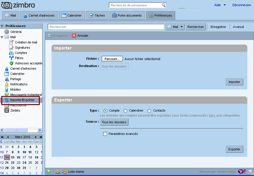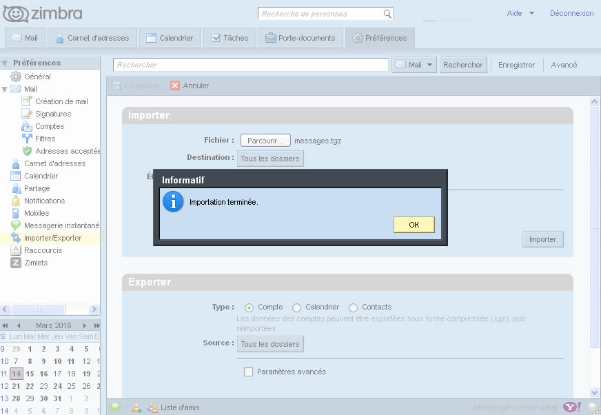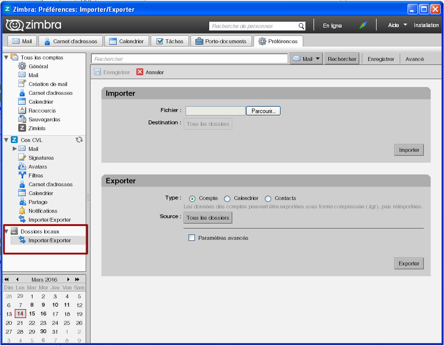 Pour importer le dossier dans Zimbra :