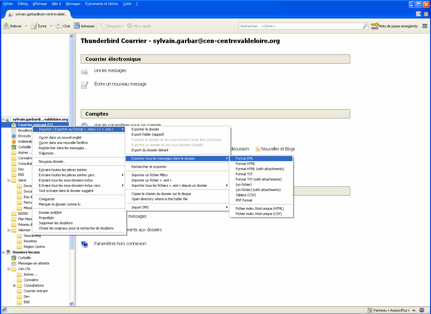 - Faire un clic de droit sur le dossier à exporter, puis Importer / Exporter au format ".mbox" / ".eml" ?Exporter tous les messages dans le dossier ?Format EML