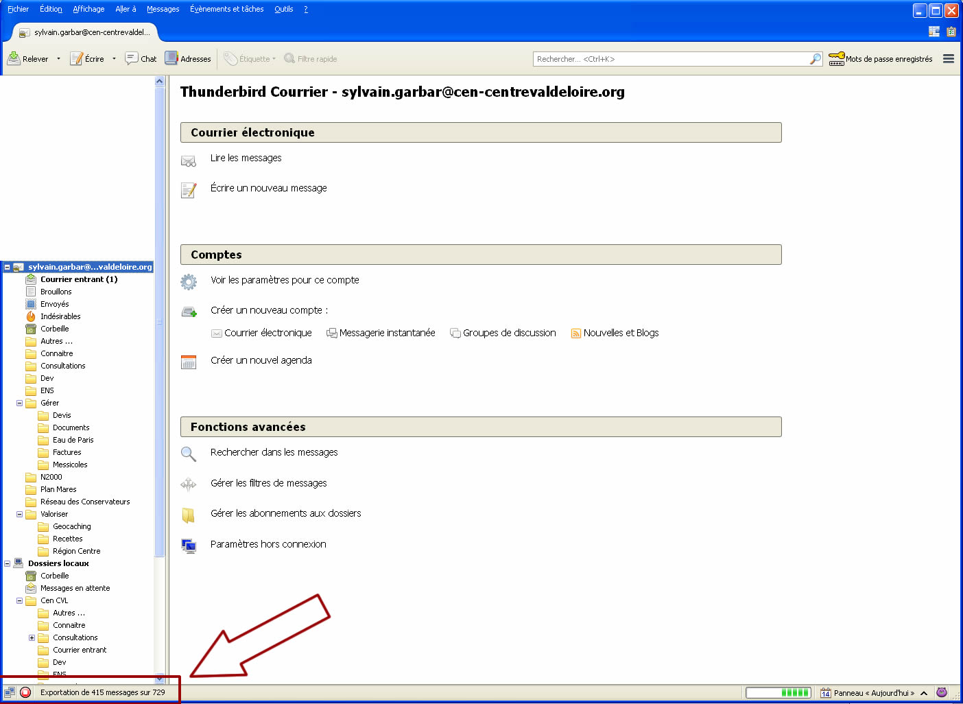 L’export est en cours et sa progression s’affiche dans la barre d’état de Thunderbird en bas à gauche