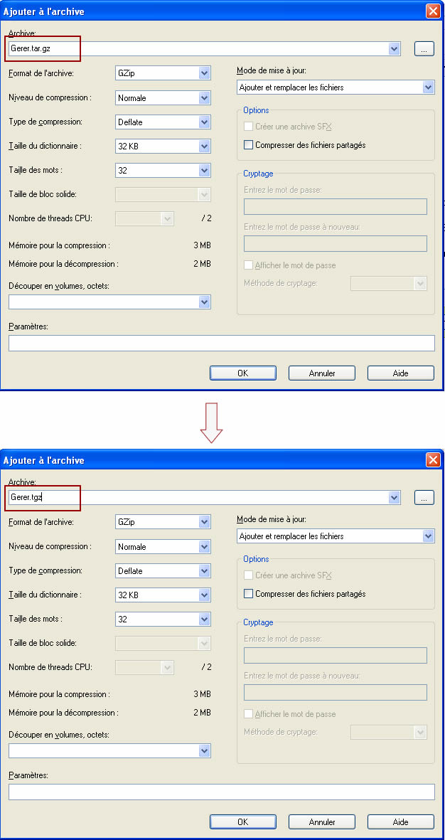 - Cette fois-ci, dans Format de l’archive, choisir GZip}. ATTENTION NE PAS CLIQUER SUR OK (ça mord !)
