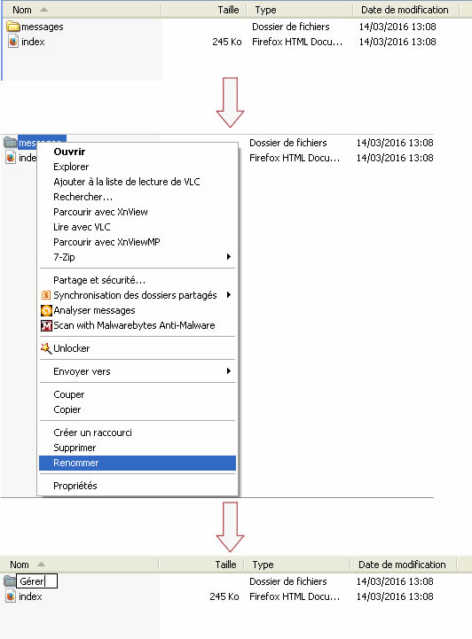 - Renommer le dossier "messages" avec le nom du répertoire qui a été exporté. Par exemple, vous si le dossier exporté s’appelait "Gérer", renommer le dossier "messages" en dossier "Gerer" (ne pas saisir de caractères accentués)